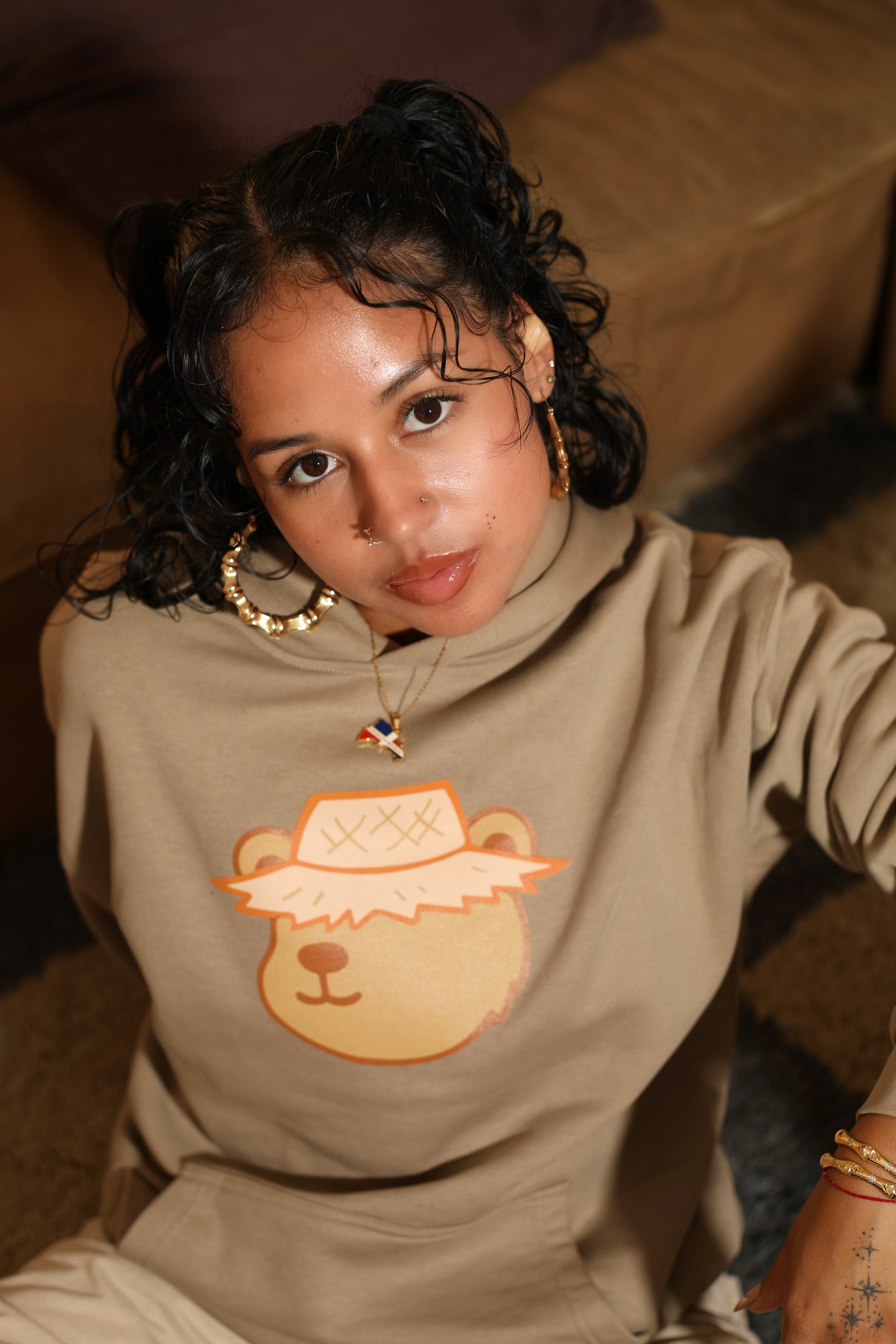 Cozy up in our signature Besitos De Coco hoodie, inspired by the scent that always feels like home. This two-tone design features our Besitos De Coco bear wearing a pava hat on the front, a nod to Caribbean pride.