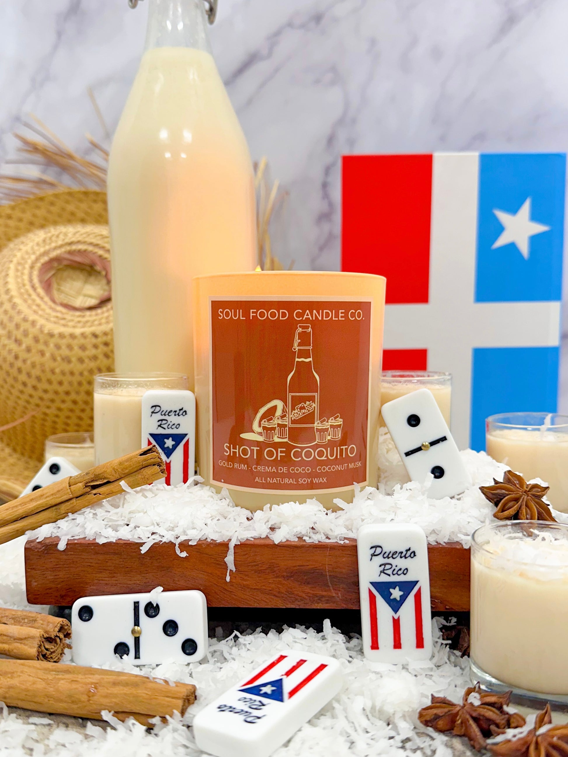 A scent inspired by the traditional Puerto Rican holiday drink. Notes of Gold Rum mixed with Crema De Coco and Coconut Musk gets the familia ready for the next dominoes match. WARNING: Lighting shot of coquito while playing dominoes may cause excitement and shouting matches.